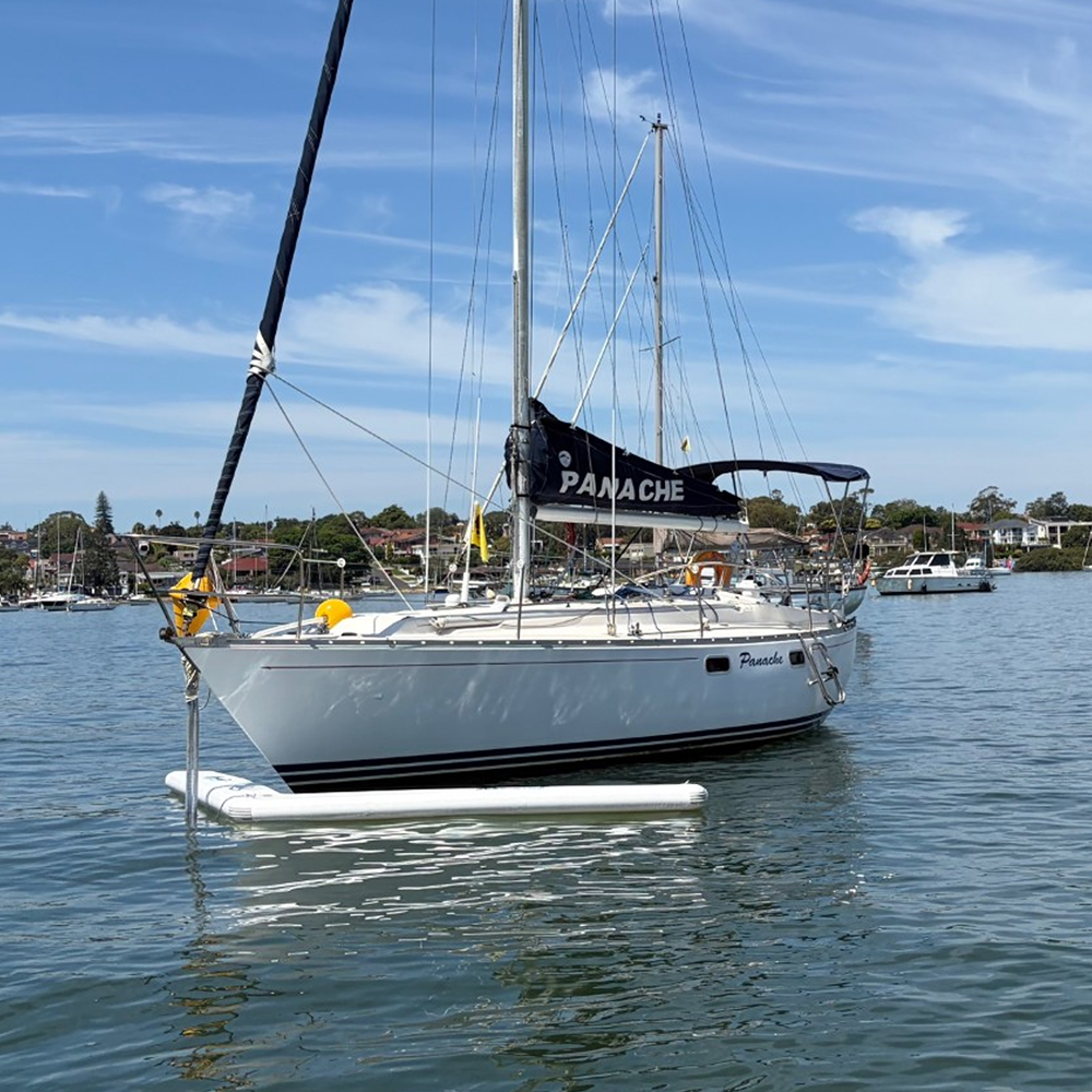 LAP-STOP™ is a floating wave attenuator for yachts and motor boats. Placed at the bow while at anchor or on a mooring, it flattens wind chop — dramatically reducing the lapping noise that makes sleeping in the v-berth a nightmare.